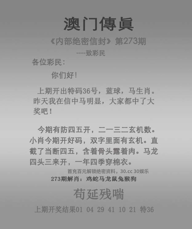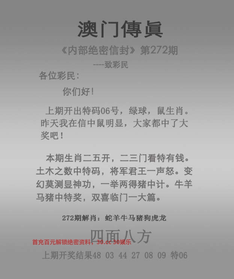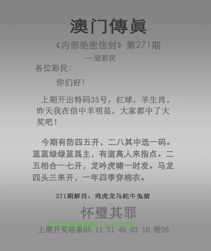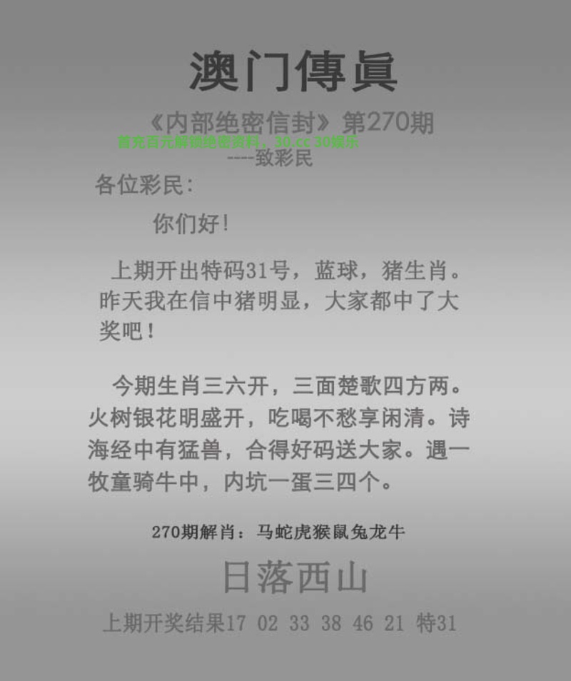 274期:澳门传真 今期生肖四五开,农民视它家中宝。一生之计在于辰,一言必中在掌中。二五相合一七开,龙吟虎啸一时发。白姐指美在七九,选好特码快下手。 【节外生枝】 生肖:鸡猪牛马狗兔龙虎 |